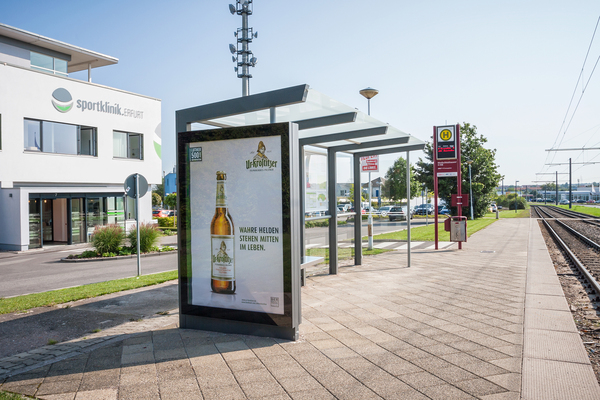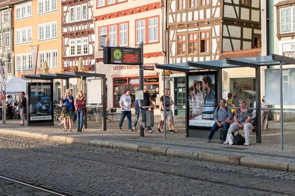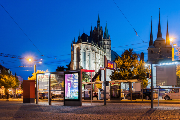 Nur ein Jahr später konnte RBL Media auch die Landeshauptstadt Erfurt von seinem Konzept überzeugen und über 200 neue Wartehallen, Stadtinformationsanlagen und Schutzzäune entlang der Stadtbahn-Linien erneuern.
